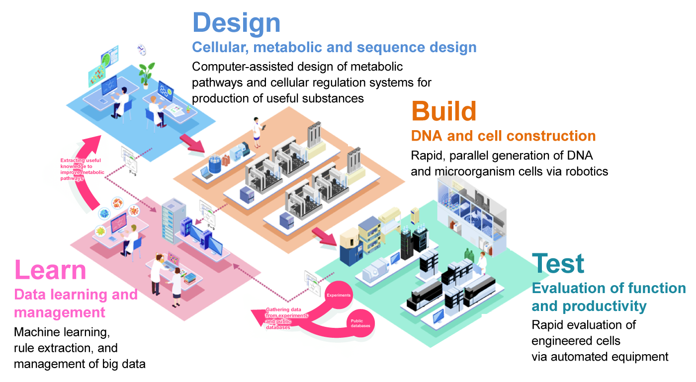 Drawing on its track record of pioneering the establishment of a “biofoundry” that accumulates the core technologies and equipment groups required to create biological materials (cells, enzymes, genes) with new functions or high performance, the Office promotes research aiming at establishing a state-of-the-art DBTL (Design-Build-Test-Learn) cycle that organically incorporates core technologies of synthetic biology, smart breeding, and advanced analysis and bioeconomy.