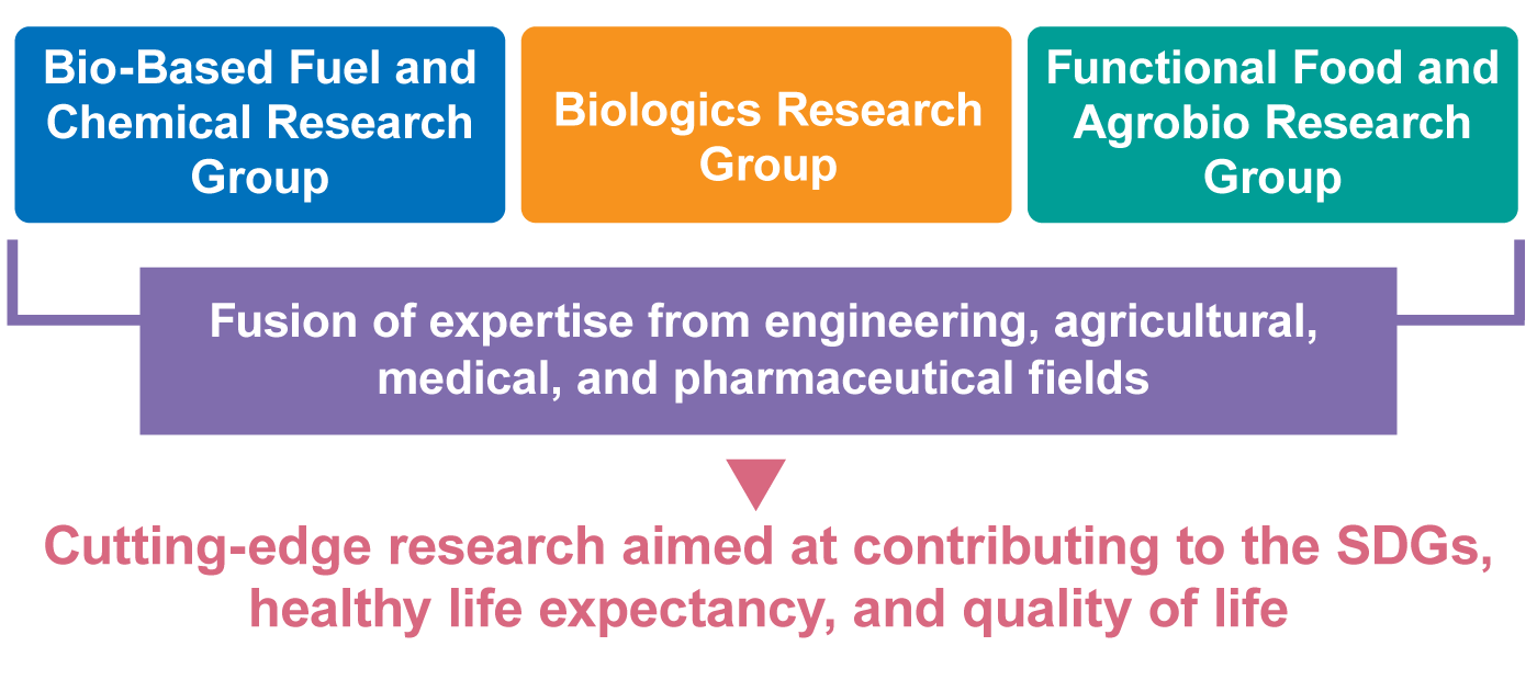 Challenges that impact our day-to-day lifestyles are growing increasingly serious, including low energy self-sufficiency and high dependence on fossil fuels due to resource shortages, a declining working population and rising medical costs due to super-aging society with a low birthrate, and unstable food supply due to abnormal climate patterns. The Smart Cell Engineering and Bioproduction Research Unit is working to increase the efficiency and precision of breeding and species enhancement through the use of smart cells, create new biopharmaceuticals from biologically-derived materials, and develop functional health foods by enhancing the performance of materials derived from agricultural, livestock, and fishery resources. The Unit's three research groups, which bring together expertise from the engineering, agricultural, medical, and pharmaceutical fields, are conducting cutting-edge research aimed at contributing to the SDGs, healthy life expectancy, and quality of life.